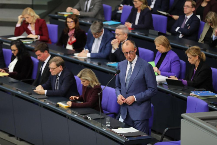 12月17日,德国总理默茨(前排右一)在位于柏林的德国联邦议会接受例行问询。新华社记者杜哲宇摄