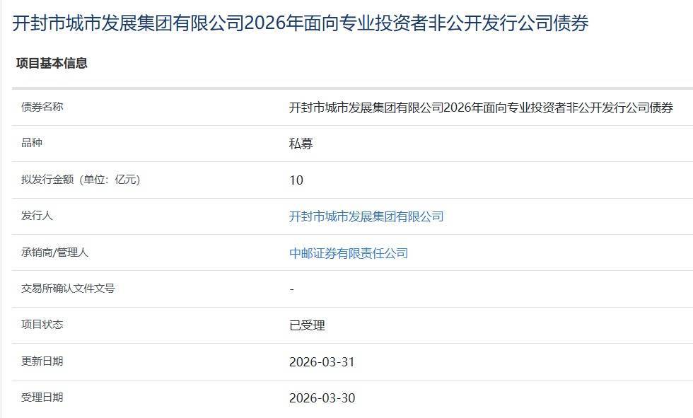 【大河财立方消息】3月31日,开封市城市发展集团有限公司2026年面向专业投资者非公开发行公司债券项目,获上交所受理。