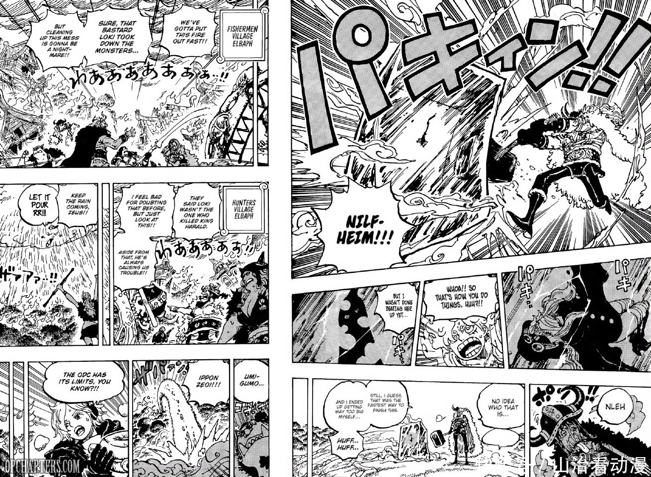 洛基王子也变回人形态,他手持铁雷直接冰封了伊姆大人和军子,战斗终于结束了,伊姆大人的黑影消失,军子被冰封起来。尼卡路飞解除五档模式,巨人族战士正在扑灭村子的大火,娜美和莉莉丝也帮忙扑灭森林的大火。