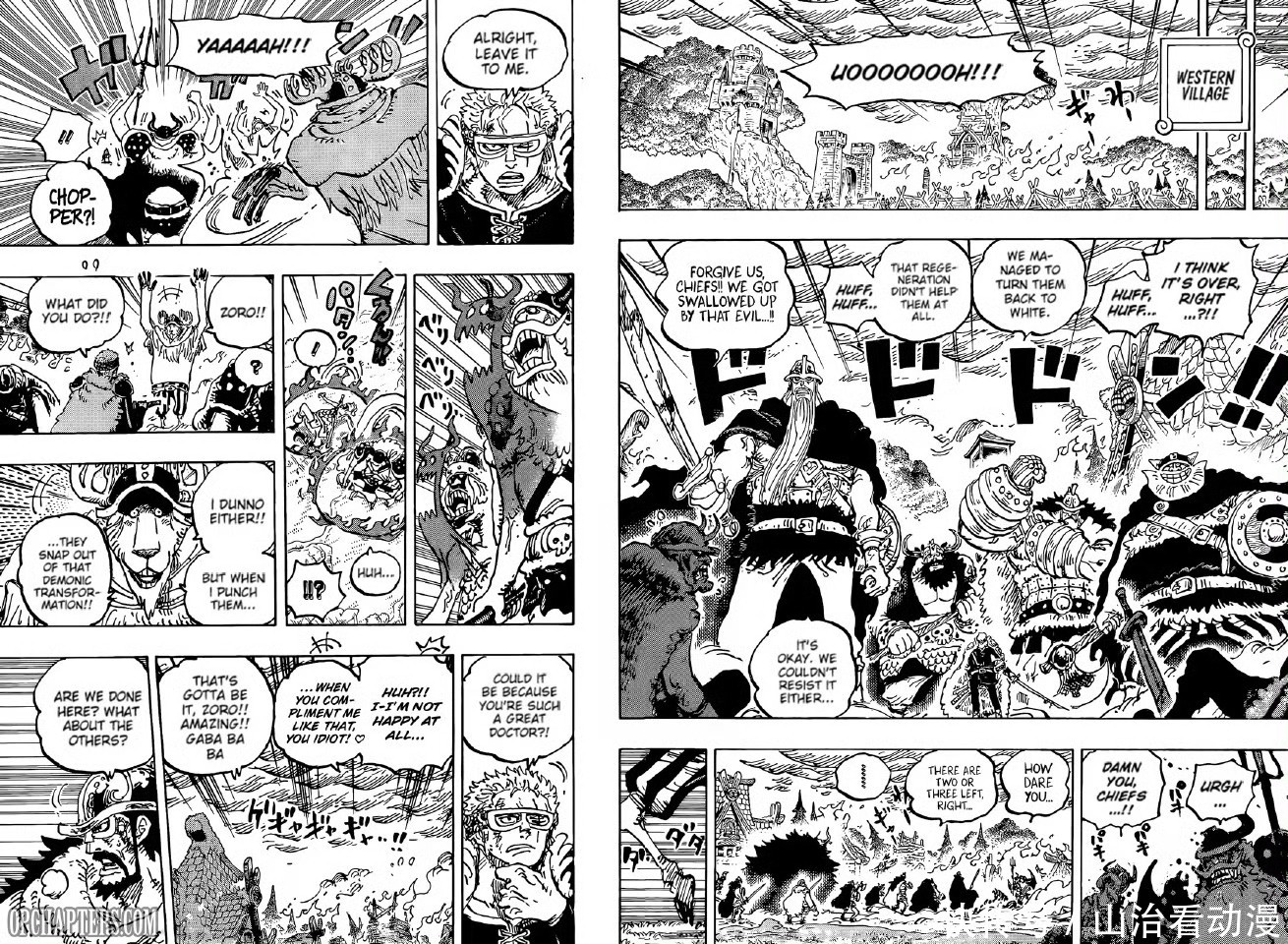 在西村,巨人族战士和恶魔傀儡的战斗即将分出胜负,乔巴过来了,他直接干掉了一个恶魔傀儡,这让索隆很震惊。乔巴也不清楚,自己拍了恶魔傀儡一巴掌,他们就恢复正常了,索隆认为乔巴是医生的原因。